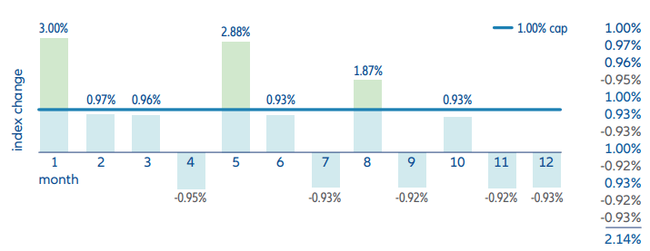 Monthly Sum: The indexed interest rate for a term year is based on monthly index changes. A monthly index change is determined by comparing the closing index value at the end of that month to the closing value at the beginning of that month. A positive monthly change in a term year is adjusted by applying the monthly cap for that term year. The indexed interest rate for a term year is the sum of the 12 adjusted monthly index changes for that term year. The credited rate will never be less than 0%.