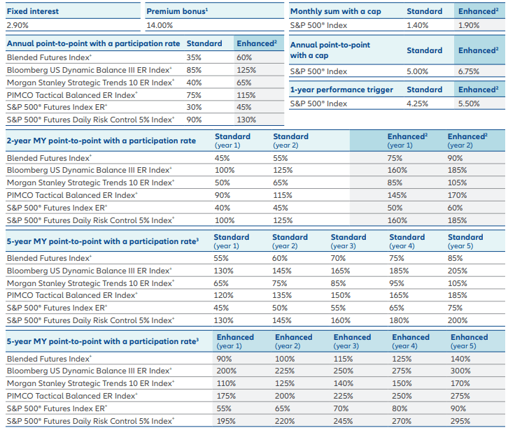 Let’s have a look at the Allianz Accumulation Advantage+ Fixed Index Annuity rate sheet (as of September 2025) to understand how the earnings are determined.