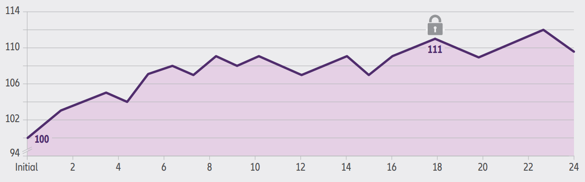 In this hypothetical example, the index value rose to 111 in month 18, at which time the decision was made to lock in the index value. The beginning index value (100) is compared to the locked index value (111), resulting in a change of 11%. If the participation rate were 80%, the indexed interest for this crediting period would be 8.8% (80% of 11%). By using Index Lock, you are able to lock in the day’s ending index value and be assured a positive index credit for the crediting period - no matter what happens during the remaining months.