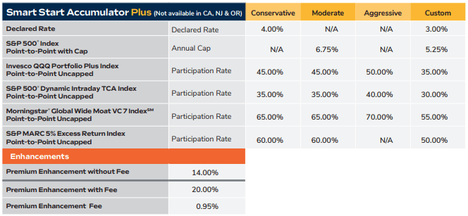 Let’s look at the high-level fine print of American National Smart Start Accumulator Plus FIA, and then we will discuss each point in detail.