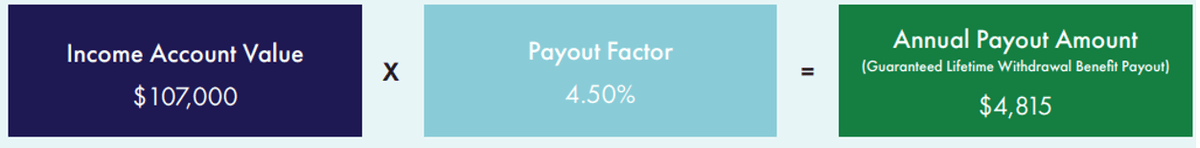 Let’s say you elect to start your income withdrawals at age 55 on a single-life basis. According to the Income Rider Single Life Payout Factors table, the withdrawal factor at age 55 is 4.50%. If your Income Account Value (Benefit Base) is $107,000 at the time of election, your annual lifetime income withdrawal would be: