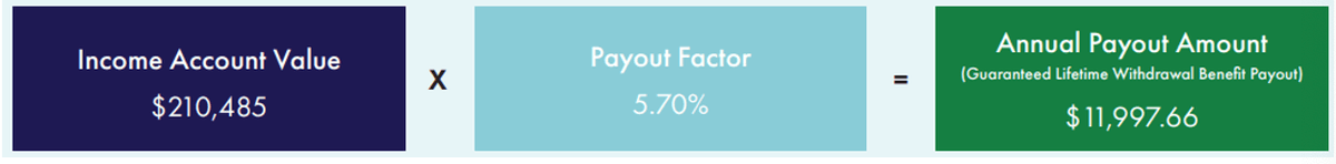 Suppose you wait 10 years; during this time, both the Income Account Value and the payout factor increase. If the Income Account Value rises to $210,485 and the payout factor at age 65 is 5.70%, the annual payout amount would be $11,998.