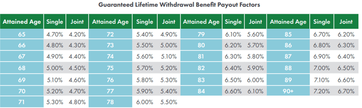 For joint life withdrawals, the percentages are lower because the benefit covers two lives. Let’s assume you start withdrawals at age 65 for both you and your spouse. The GLWB Joint Life Payout Factor for age 66 is 4.20%. Assuming a Benefit Base of $250,000, your annual income withdrawal would be: