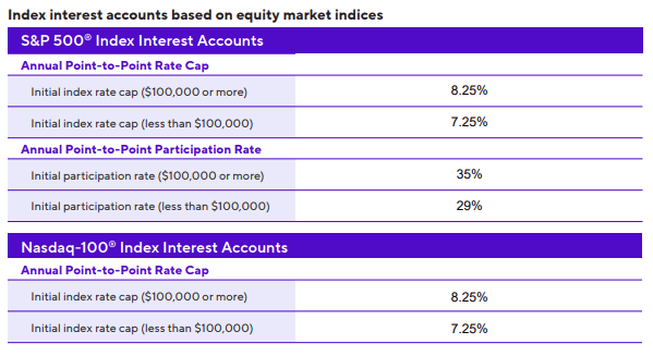 Among these indexes, I prefer the S&P 500 Index with a cap rate option, the Nasdaq-100 Index with a cap rate option, and the Dimensional U.S. Foundations Index with a participation rate strategy. I would avoid the other strategies because (i) the remaining indexes are all volatility-controlled, which limits upside potential, and (ii) the participation rates offered for those strategies are relatively low.