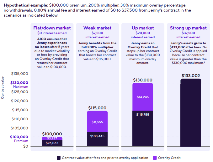 The overlay is based on the lower amount, so the annuity is stepped up to $115,000. If the contract value after fees is $103,445, AICO adds an Overlay Credit of $11,555, more than offsetting the cumulative fees deducted during the five years