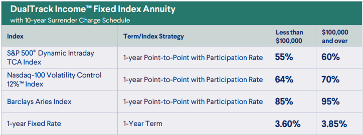 It is very important to note that, like other Fixed Indexed Annuities, the Delaware Life DualTrack Income Fixed Indexed Annuity comes with participation rates for these indexes, meaning that you will be credited only a part of the index return to your annuity. These rates change frequently; I will discuss these rates more briefly.