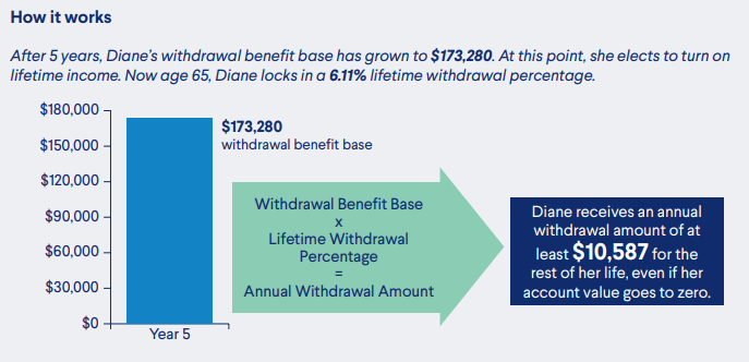 Even if her account value later drops due to poor market performance, Diane continues receiving at least $10,587 annually for as long as she lives.