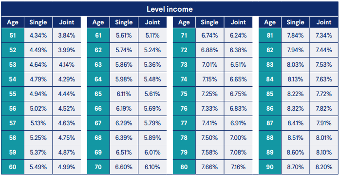 The table(s) below show the Lifetime Withdrawal Percentages, updated as of the date of writing this article.