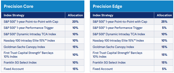 The annuitant can also choose from two model Precision Portfolios, which are designed to offer diversification benefits without the need to select indexing strategies manually. Each portfolio is constructed with set percentage allocations to individual index strategies from providers such as S&P, Nasdaq, Goldman Sachs, First Trust, and Franklin Templeton, along with an allocation to the fixed account.