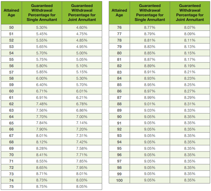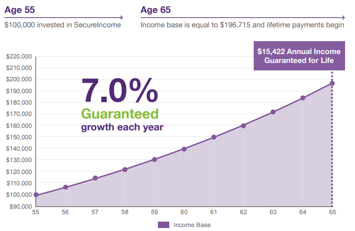 Income Base × Payout Factor = Annual Lifetime Withdrawal Amount The payout factor is based on the annuitant’s age at the time withdrawals begin and the number of years since the contract was issued. These rates are pre-determined when you sign up for the annuity contract. The following are the payout factors of the SecureIncome annuity at the time of writing this article: