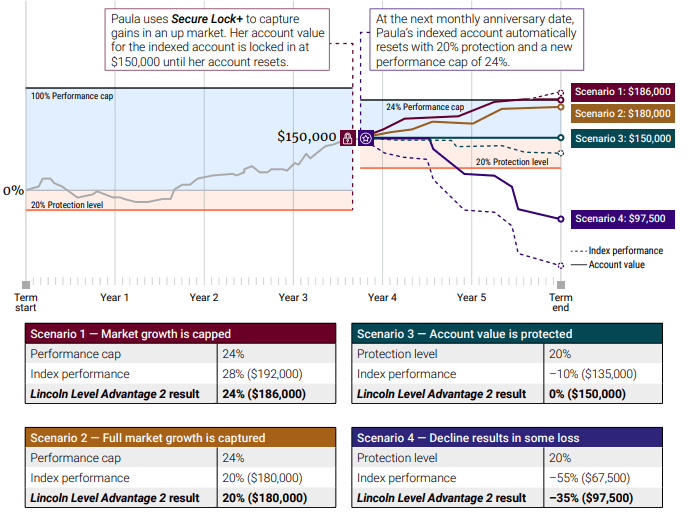 2. Secure Lock+ Feature: It is an optional feature of the Lincoln Level Advantage 2 Advisory index-linked annuity that allows you to “lock in” gains during your term without waiting for the end date. When you activate Secure Lock+, your current indexed account value is preserved, and you have the choice to either automatically reset the account on your next monthly anniversary or hold the locked value until your next yearly anniversary. Once the account resets, your protection level remains the same, but you start with a new performance cap and a fresh starting index value for the remainder of the term.