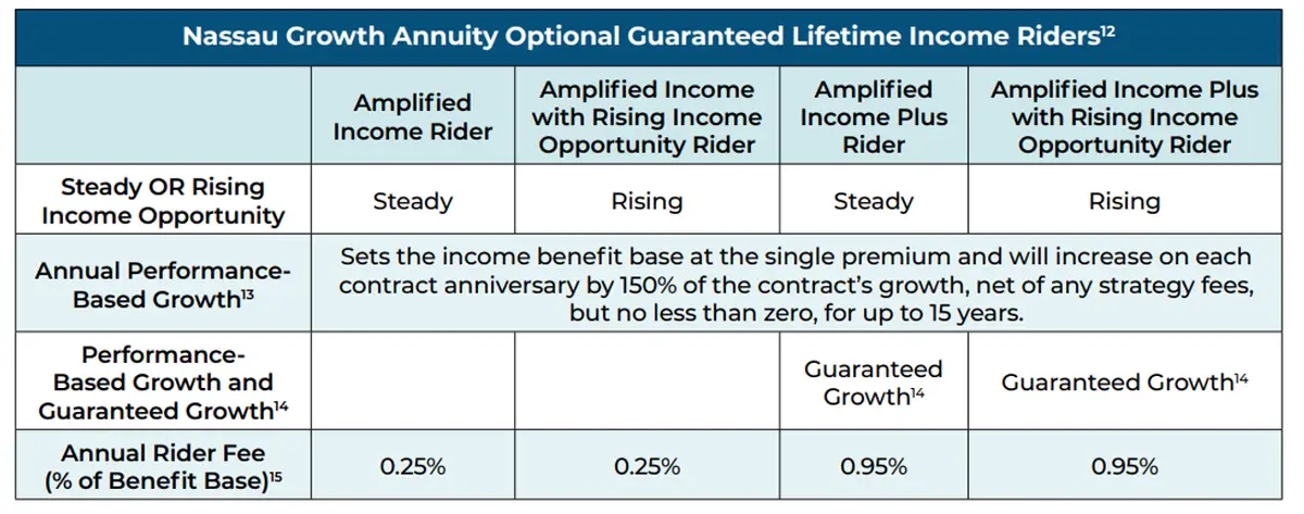 The Nassau Growth Annuity Fixed Indexed Annuity offers four optional paid lifetime income riders, each tailored to provide guaranteed income while addressing varying preferences for steady or rising income. These riders enhance the annuity's appeal by combining guaranteed growth with performance-based increases, ensuring flexibility and security for annuitants. Here’s a detailed look at the available riders: