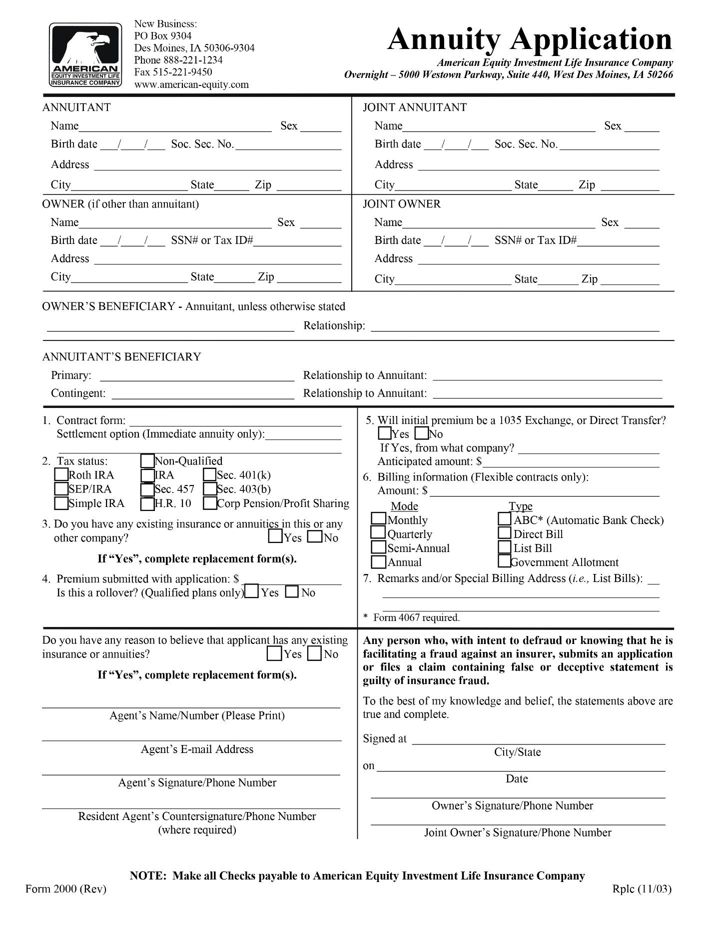 Annuity Application Form: The primary document that captures the contract details and parties involved. It typically includes:
