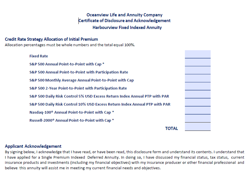 Credit Rate Strategy Allocation of Initial Premium: The annuitant must select how their initial premium will be allocated among various indexing strategies. For example, the Oceanview Harbourview Fixed Indexed Annuity offers the following credit rate strategy allocation options: