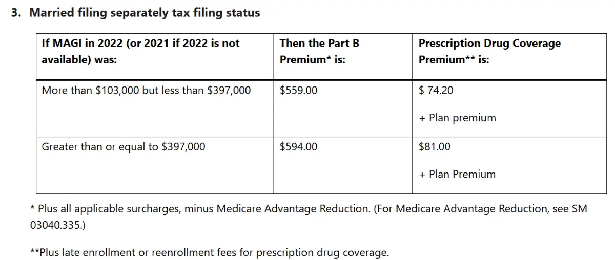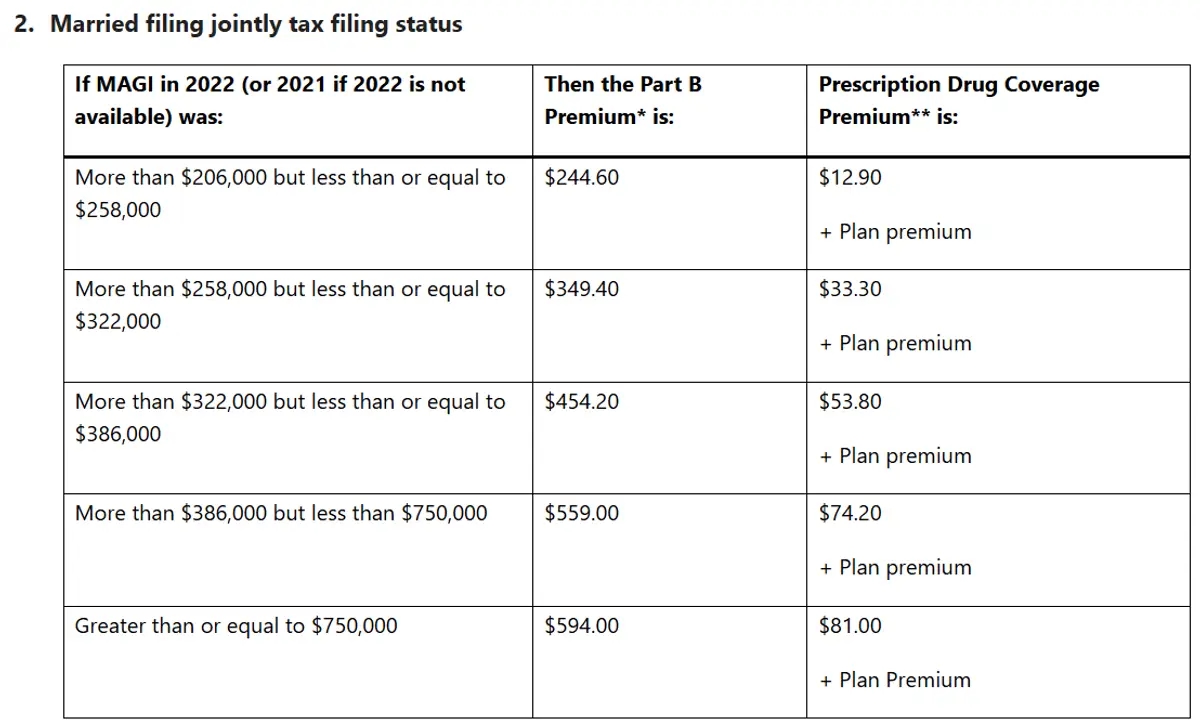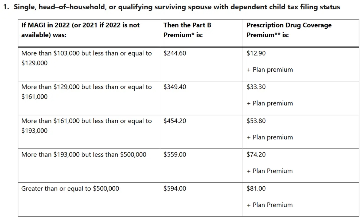 Healthcare.gov has a table of income types that is included in MAGI. Once the beneficiary’s MAGI, from the correct filing year is calculated, the beneficiary can use the tables provided by the SSA to determine their IRMAA premium. There are three tables that are used. The tables are categorized by tax filing status: Single, head–of–household, or qualifying surviving spouse with dependent child, Married filing jointly and Married filing separately. Tables for 2024 are shown below. (Social Security Administration, 2024)