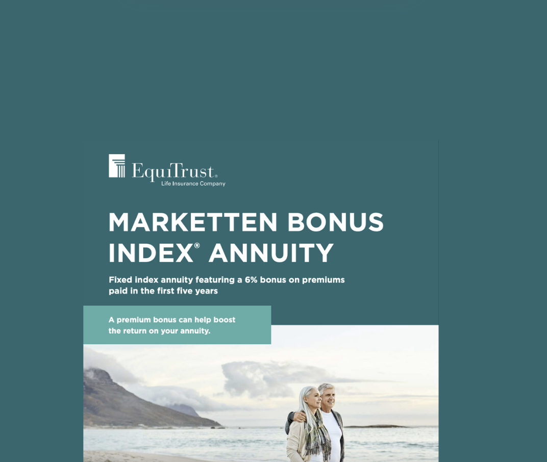 The EquiTrust MarketTen Bonus Fixed Indexed Annuity allows for flexible premium contributions. An 11% premium bonus is applied to all premiums added within the first five years, and both your premium and the bonus are credited to your Accumulation Value. From there, you will earn interest and index credits on the total amount, including the 11% bonus, enhancing the potential growth of your annuity.